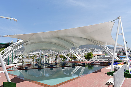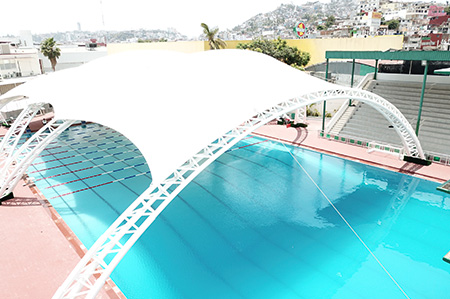 A principios de 2024, comenzamos un ambicioso proyecto en Acapulco: la instalación de un toldo arquitectónico para la alberca olímpica del IMSS. El diseño no solo debía cubrir grandes claros, sino también resistir las condiciones climáticas extremas de la zona. Como prueba de su calidad, el toldo soportó los huracanes del año sin ningún daño.